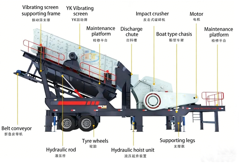 【Application】:Mobile impact crusher and screening plant is easily movable and transferable crushing machines used to reduce the size of rocks and other materials in aggregates production, recycling applications and in mining operations. It produces good shaped cubical products.