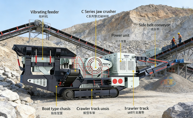 【Application】:A crawler mobile crusher is an integrated stone crushing system mounted on a heavy-duty track chassis. Crawler models thrive in rough, off-road conditions. There's no separate installation, concrete foundations, or external power sources (most are diesel-powered, with electric options available).