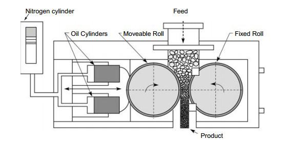 Adjustment of the discharging materials: wedge-shaped or gasket adjustment device is installed between the two rollers; adjusting bolt is installed on top of the wedge-shaped device, and when the wedge is pulled up by the adjusting bolt, it will push the dynamic roller pulley away from the fixed pulley, thus making space between the rollers wider and particle size bigger;