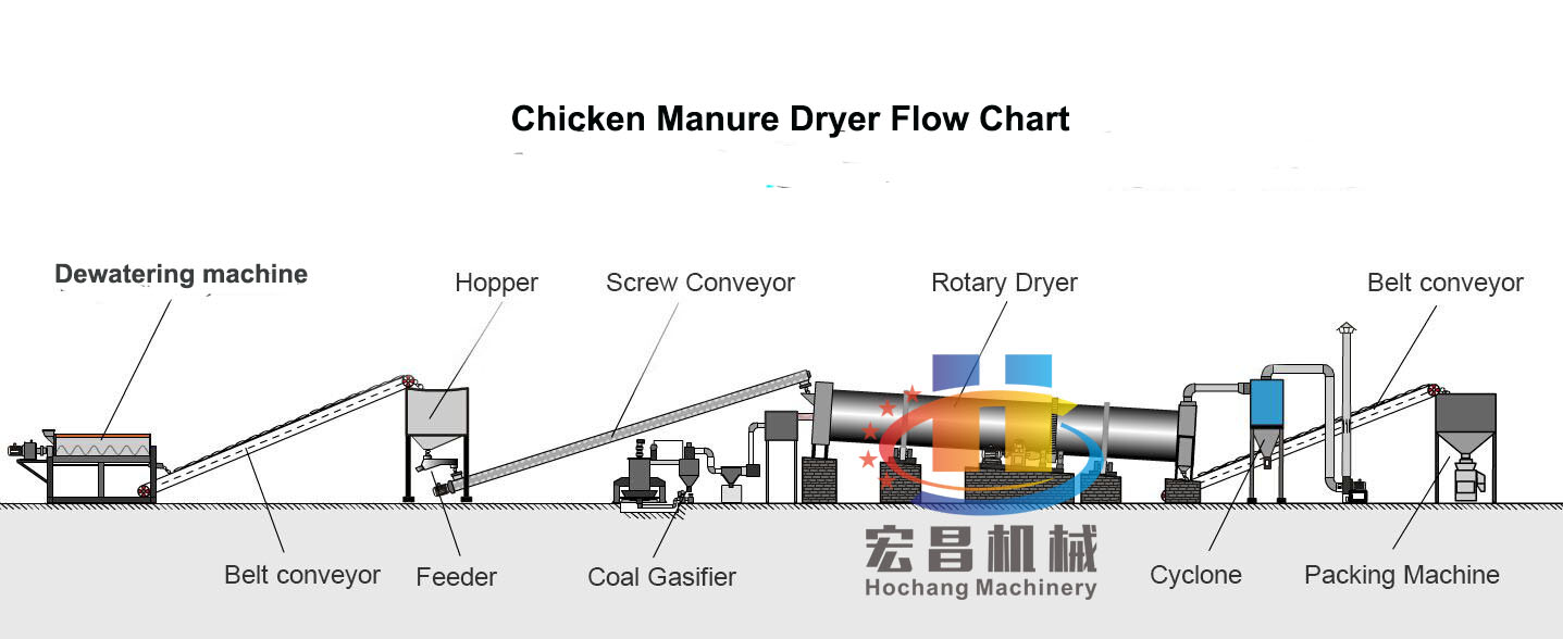 Zhengzhou Hochang Chicken manure dryer is a type of drying equipment employed to reduce or minimize the liquid moisture content of the material it is handling by bringing it into direct contact with heated gas.The moisture content in the dried chicken manurenormally isunder 10%.